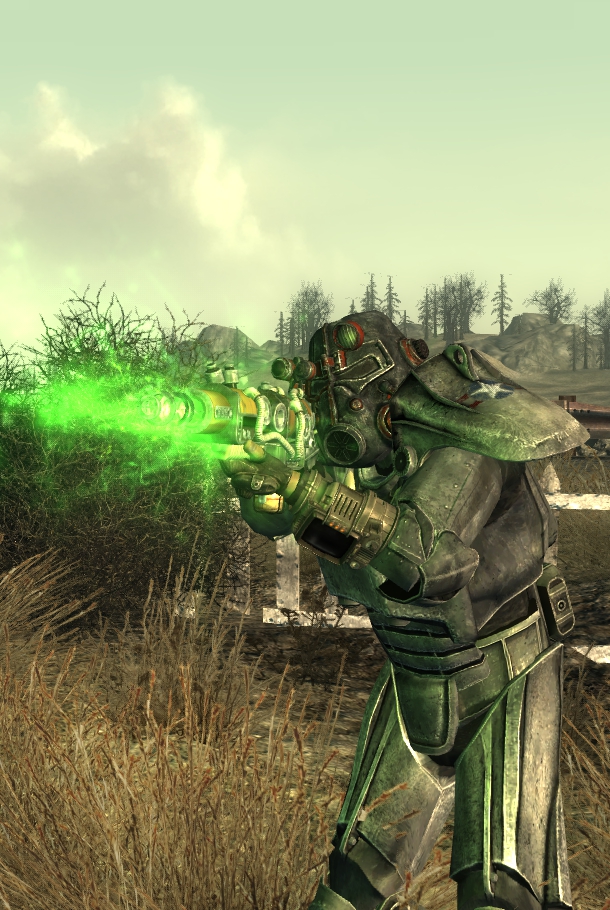 Moja (pierwsza) postać z Karabinem plazmowym. W zasadzie jest to jedna ze skuteczniejszych broni, jednak wystrzelona plazma ma stosunkowo małą prędkość. W związku z tym trzeba albo nauczyć się strzelać do uchomych celów z dużym wyprzedzeniem, albo korzystać wyłącznie z VATSa. Poza tym efekt krytycznego zabicia z tej broni jest... ciekawy :) . |