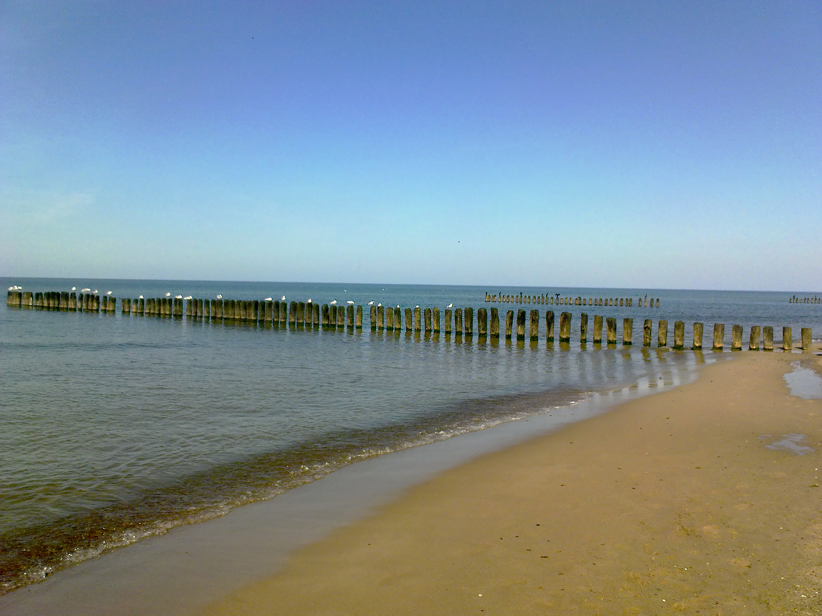 Wyłącznie białe ptaki (mewy) na pierwszym falochronie, a czarne (kormorany) na drugim.