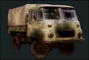 Po dłużej chwili ciszy doszedłem do wniosku, że rozmowa właśnie się zakończyła. Skończyłem akurat jeść, czy raczej miałem już dość tego smaku, bo w wiadrze nadal było to mięso. Nadeszła chwila na szybką naukę jazdy ciężarówką. W związku z tym zacząłem wychodzić ze stołówki. I teraz mi się przypomniało, dlaczego poprzednia rozmowa była jakaś dziwna. No i Chudy na początku jakby nie chciał zacząć rozmawiać. A to wszystko dlatego, że za mną cały czas chodził jeden ze strażników. Co prawda wcześniej było ich dwóch, ale jeden z nich gdzieś najwidoczniej sobie poszedł. No i pojawił się problem. Nie wiem, gdzie stoją te ciężarówki. Po chwili strażnik, widząc mnie rozglądającego się po terenie, skapnął się, o co mi chodzi. Powiedział tylko "Chodź za mną..." i podążyłem za nim. W bazie stał ceglany budynek, który od niewidocznej do tej pory strony miał bramy roletowe. Weszliśmy do środka. To był jeden wielki garaż z dwoma kanałami do napraw. Na boku stały dwie stare ciężarówki typu Robur. Obydwie były w malowaniu z kamuflażem pustynnym. Widać było, że w ciągu swojego "żywota" dużo już przeszły. Świadczyła o tym wszędobylska korozja, a także dziury po kulach na karoserii. W niektórych oknach z kabiny było widać potłuczone szyby, posklejane jakąś taśmą. Pojazd wyglądał jak wrak, ale silnik zapewne był sprawny. Strażnik otworzył drzwi od strony kierowcy i kazał wejść do środka. Sam zajął fotel pasażera. Wnętrze było całe w brudzie. Wszędzie był jakiś piach i kurz. Trzeba było także uważać na kawałki szkła z potłuczonych wcześniej szyb. Po podłodze walały się nawet łuski. Gdy przyjrzałem się dokładniej, dostrzegłem zaschnięte ślady krwi na drzwiach od wewnątrz. Gdy strażnik zajął już swoje miejsce, powoli wytłumaczył mi funkcje różnych elementów w kabinie. Powiedział też, że ponieważ mają stosunkowo mało paliwa, nie pojeżdżę sobie za długo.