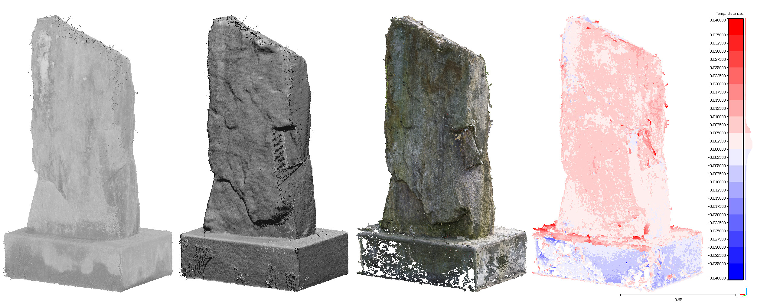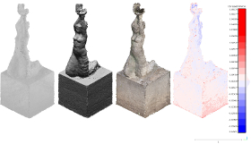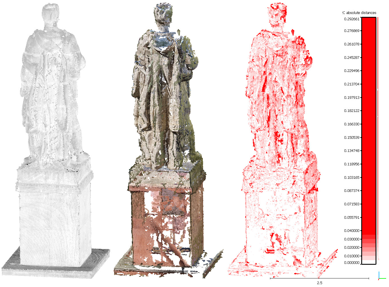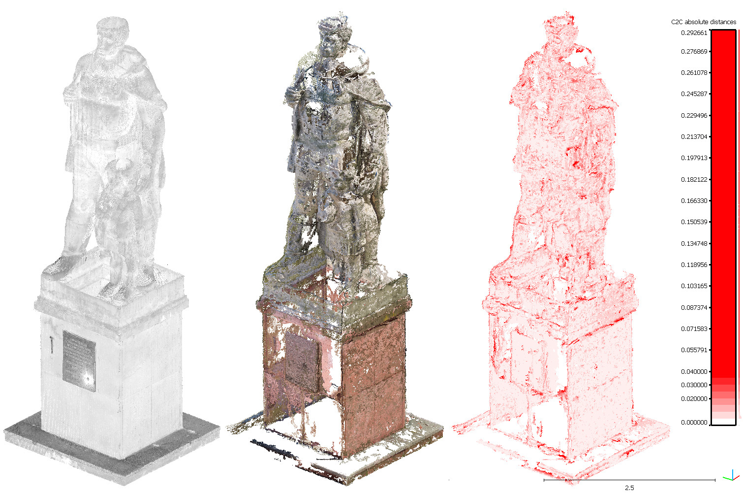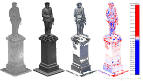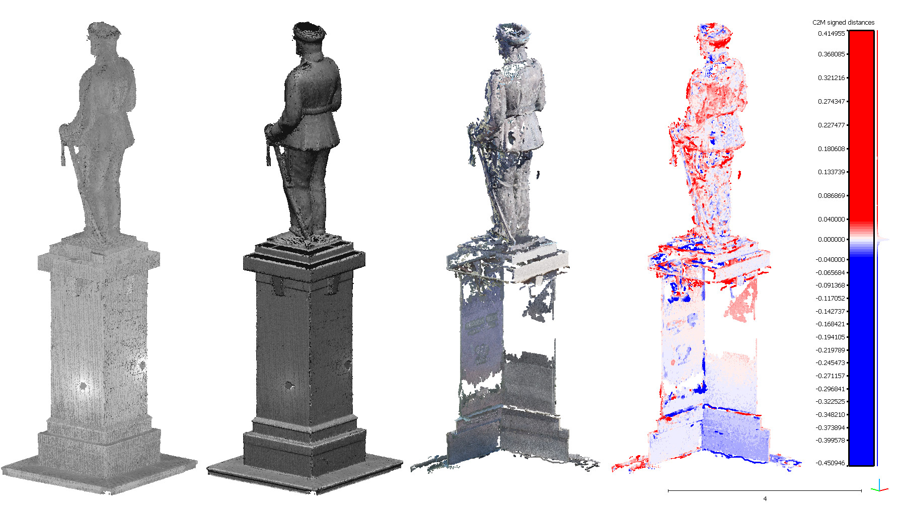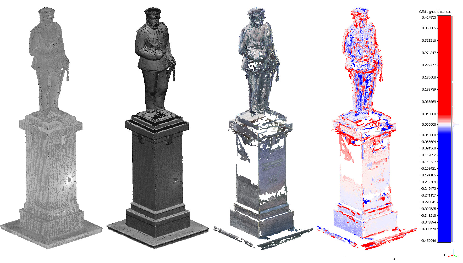 The master’s thesis comparing two methods of land surveying – Laser Scanning and Dense Stereo Matching, which uses image pair detection from unsorted cluster of photos lacking exterior and interior orientation data and processes them to colored point cloud result. The context of measurements was to create point clouds of sculptures and monuments. Six exemplary objects varying with size, material, reflection and detail level were chosen locally in the city of Koszalin, Poland. Distances of control lines were measured on two models (from a scanner and from cameras), as well as directly on each object using measuring tape. Differences for each measurement, along with derived arithmetic means and standard deviations were presented as result. The comparison was also performed in CloudCompare software using Cloud to Cloud algorithm resulting in both digital and graphical results. The thesis consists of 145 pages in total.