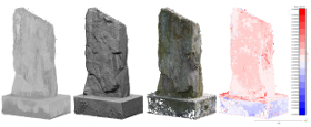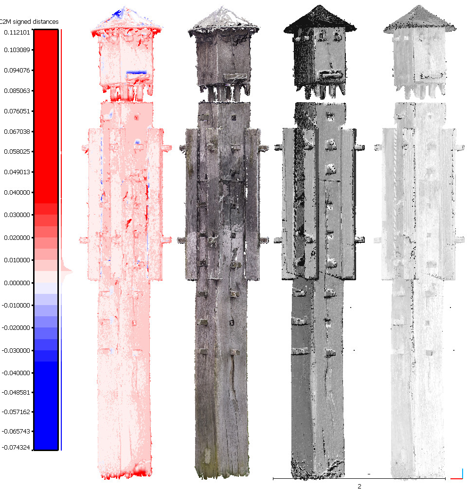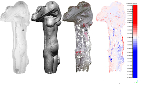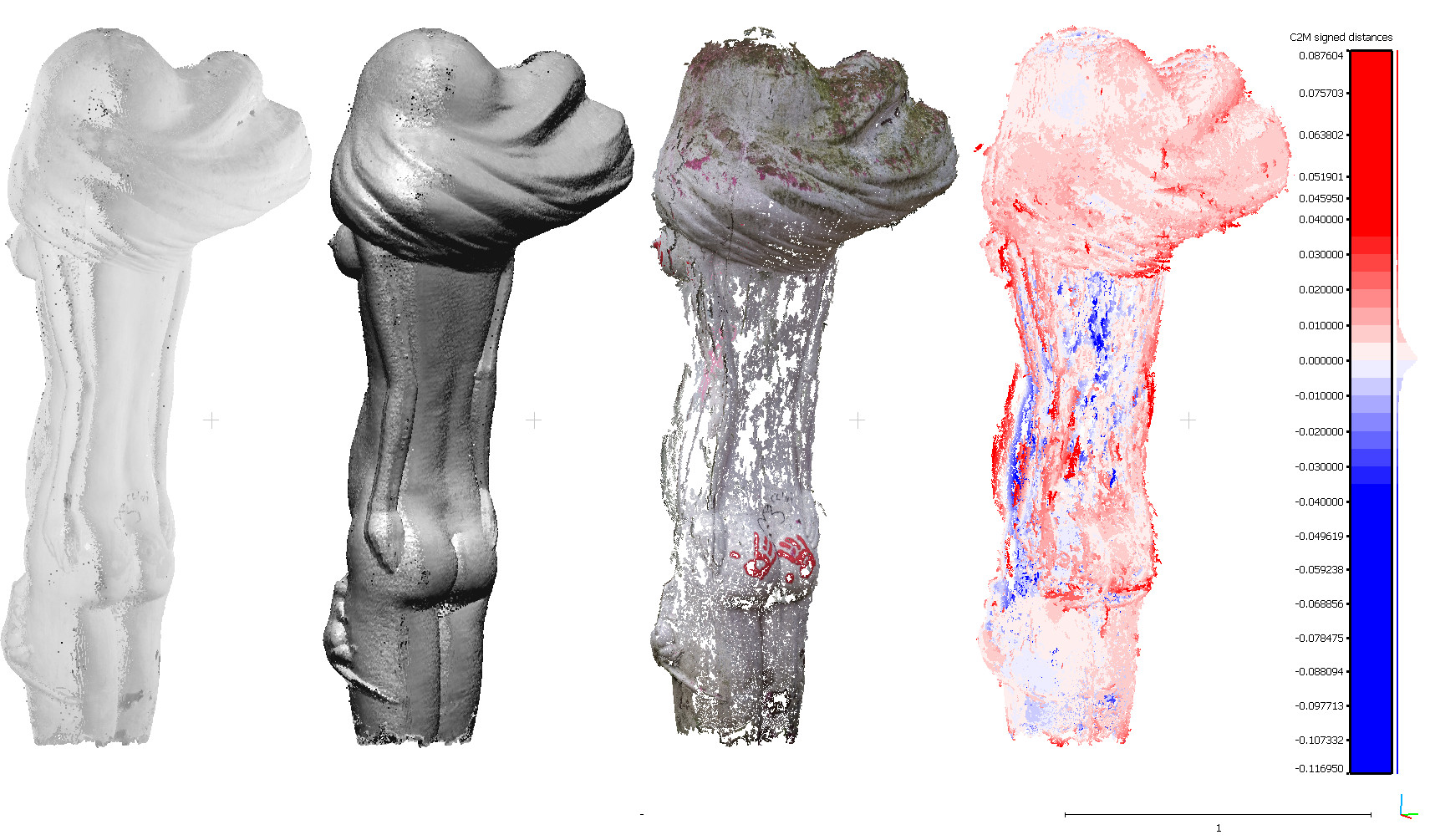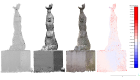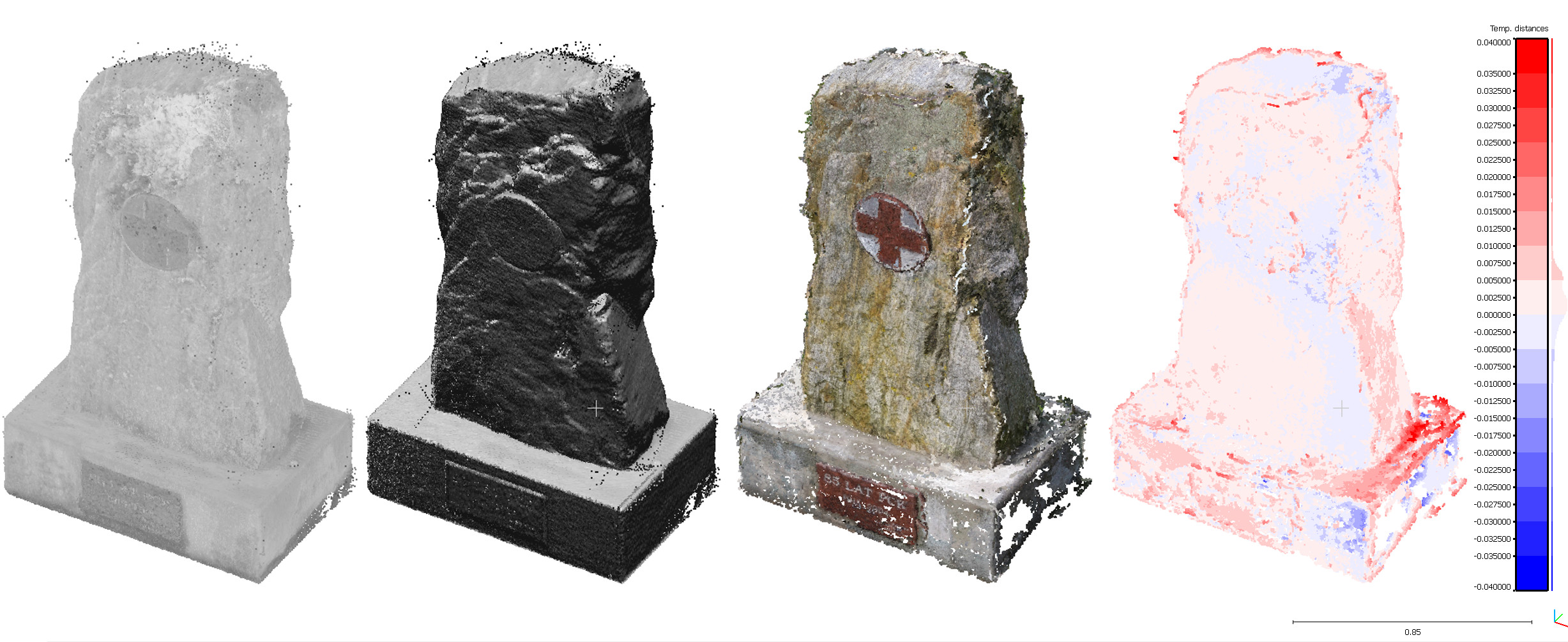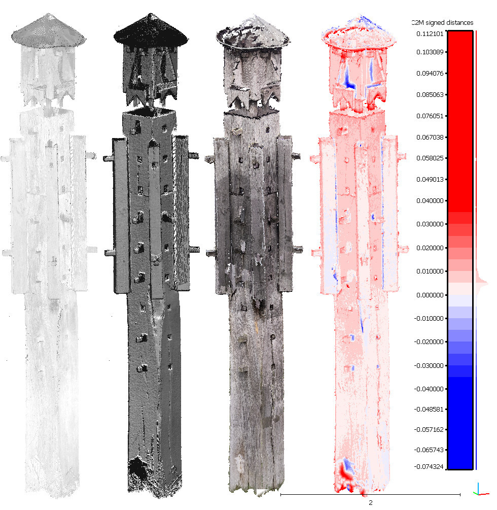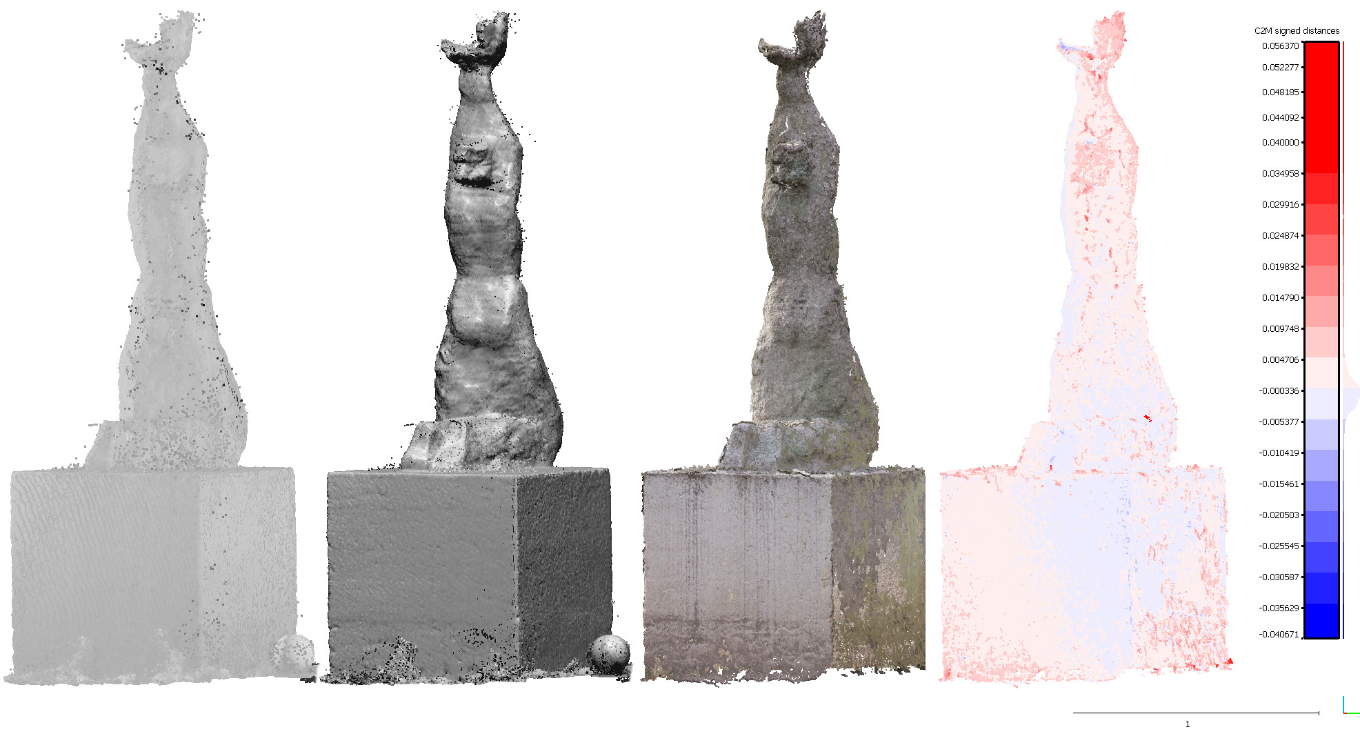 The master’s thesis comparing two methods of land surveying – Laser Scanning and Dense Stereo Matching, which uses image pair detection from unsorted cluster of photos lacking exterior and interior orientation data and processes them to colored point cloud result. The context of measurements was to create point clouds of sculptures and monuments. Six exemplary objects varying with size, material, reflection and detail level were chosen locally in the city of Koszalin, Poland. Distances of control lines were measured on two models (from a scanner and from cameras), as well as directly on each object using measuring tape. Differences for each measurement, along with derived arithmetic means and standard deviations were presented as result. The comparison was also performed in CloudCompare software using Cloud to Cloud algorithm resulting in both digital and graphical results. The thesis consists of 145 pages in total.